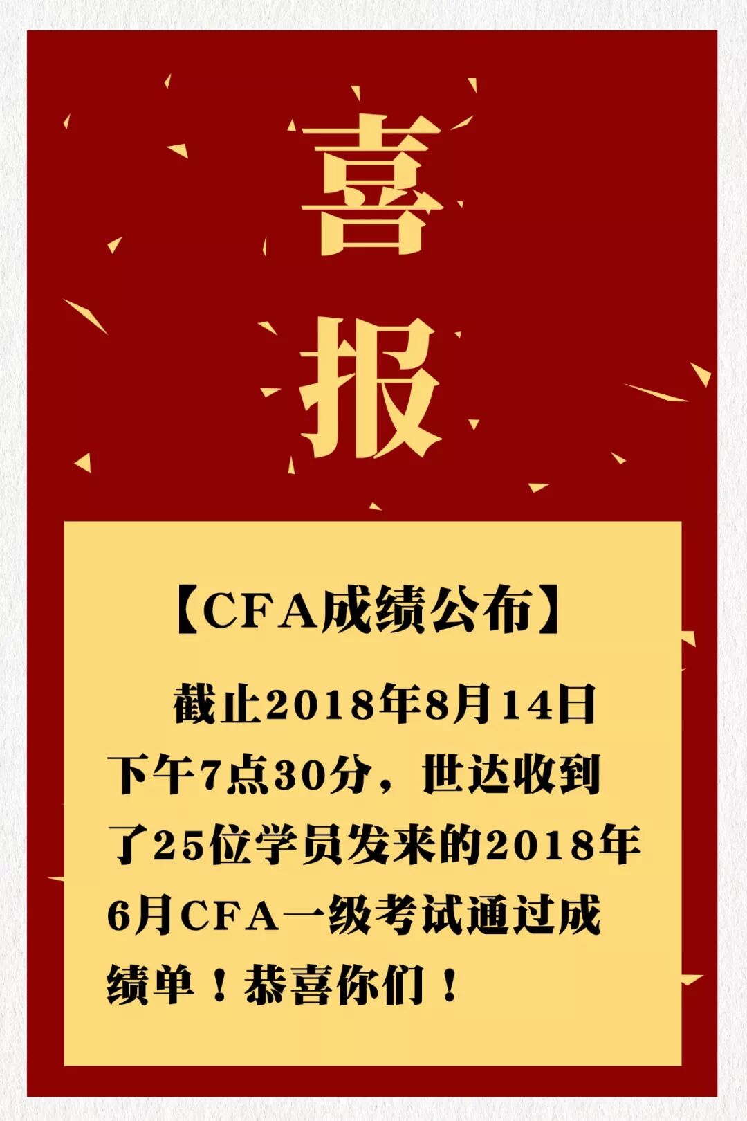 【CFA官方成绩公布】恭喜世达CFA学员再创佳绩! 小提示:CFA官方仍在持续发送成绩单,暂未收到邮件的同学们不用着急。世达等你好消息! 2018年1月13日,世达CFA 一级全科班正式封班开课2018年5月27日,世达CFA一级全科班所有课程结课2018年5月27日,世达CFA冲刺班封班开课2018年6月9日,世达CFA一级冲刺班结课2018年6月23日,CFA一级开考从一月到六月,从冰雪皑皑到夏日炎炎。161天,3864小时,231840分钟,13910400秒。每一分,每一秒。世达CFA全体师生都在奋斗着。 CFA一级从来就不是一场简单的考试,它的覆盖面广,知识点难,有些内容看上去与大学课程相关,但其实更广更深,侧重面也不同。官方配套的备考书籍有6本,书厚纸薄字小,想要在短时间内通读,完全不可能做到。 CFA 一级官方教材 世达教育的老师们为了帮助考生成功通过CFA一级,从官方备考书、权威CFA辅导资料中提炼出了最精华的考点知识,力求用最简单最直接的语言帮助学生理解知识点,用最合理最有逻辑的方式帮助学生整理知识框架。 世达CFA独家核心资料 多少次老师们一遍又一遍地翻读厚厚的CFA官方备考书只为把教案准备得精确更最精确一些;多少次老师们牺牲自己的休息时间在微信上在电话里为学生们答疑解惑。 多少次学生们风雨无阻地来世达上课;多少次学生们为了CFA考试挑灯复习到深夜。 成功向来是给脚踏实地、奋发向上的人准备的。世达CFA全体师生的努力最终换来了一个又一个成功通过考试的好消息! 8月14日,CFA协会陆续向2018年6月考试的CFA一级考生发放成绩单,下面是协会公布的本次考试的官方通过情况: 本次官方通过率仍然是43%,但截止到今日晚上7点30分,世达一共收到25名学员成功通过CFA一级考试的好消息,下面是部分学员的成绩单节选: 一张张的成绩单是世达教育教学水平的证明,也是世达CFA全体师生努力的成果。 衷心祝贺所有通过了CFA一级考试的考生们! 输 这场考试是你们迈向特许金融分析师的第一个台阶!祝愿你们百尺竿头更进一步!早日迈进你们梦想中的高端金融行业! 目前,CFA一级零基础保过班,7月班已经正式封班开课,8月班即将封班开课,9月班大部分已被预订,只剩少数名额。2018年12月备考CFA一级的考生们请尽快咨询客服报名。通过了本次CFA一级考试的同学们,二级也已经可以在CFA官网报名。世达CFA Level2 全科班近期将开班!期待在下一次的世达CFA喜报上看到你的身影! 开始时间 6:00 下午 星期三, 八月 15, 2018 完成时间 11:00 下午 星期三, 八月 15, 2018 分享:
